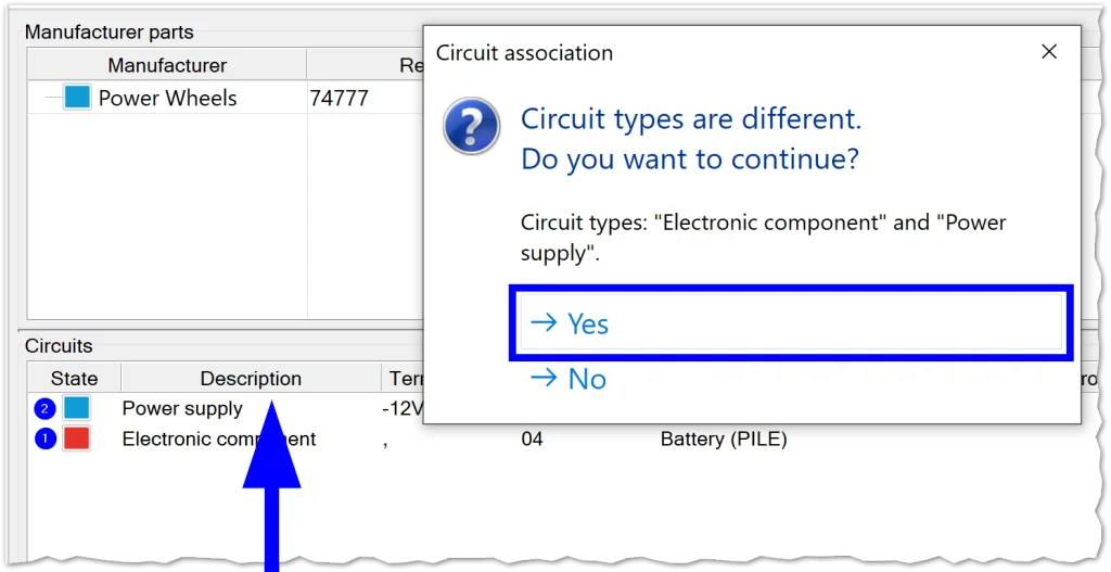 Taking a closer look, we can see that our circuit types don’t match so the circuits aren’t associating. Eek! We could solve this by modifying the circuit type in our part or by modifying the circuit type in our symbol, but I decided I was in a hurry this time, so I took a shortcut. Another way to solve this issue is simply by dragging and dropping the red onto the blue (red = circuit on the page, but not available in parts, blue = circuit available in part but not represented on the page). This forces an association and we’re good to go! Just remember to click Yes when the program points out that the circuit types are different.