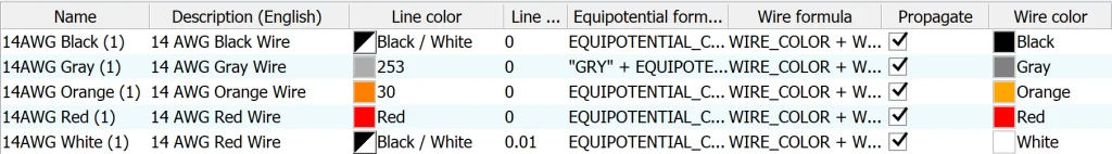 Now we can create some custom wires. Note that these wires are stored on a project level, so if we want to use them again, we will need to either create a Macro out of them or save them in our Project Template. I started by creating a new custom group and a single 14 AWG wire. Then I copy/pasted the wire four times and modified the clones so that they were all unique colors. I also modified the Equipotential Formula so that it would include the wire color since white and black wires are difficult to differentiate between in schematics. Here’s what our finished custom wire styles look like: