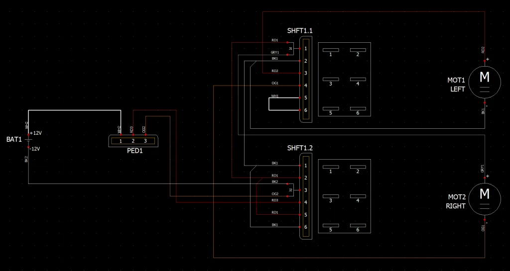 Moving on, I went ahead and used some standard connector symbols and a DC Motor symbol to complete the design. The only custom symbol I created was a simple Connection Label for the 6 pin connectors in the Shifter Assembly to clarify the layout. I did this by opening my Symbols Library and selecting to import a dxf file. From there, I made sure to specify that it was a Connection Label type of symbol and I added numbers to specify the location of terminations. Here’s the final product: