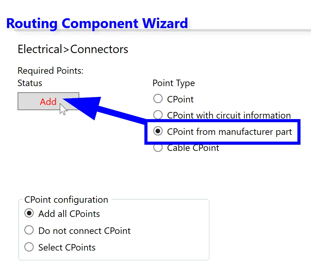 To do this, we can simply select CPoint from manufacturer part and then click Add. Next we can select our part from our library and Right-click > Create Connection Point before clicking on a sketch point (or a face in an approximate position) to create our routing point and associate it with the terminal in our actual part.