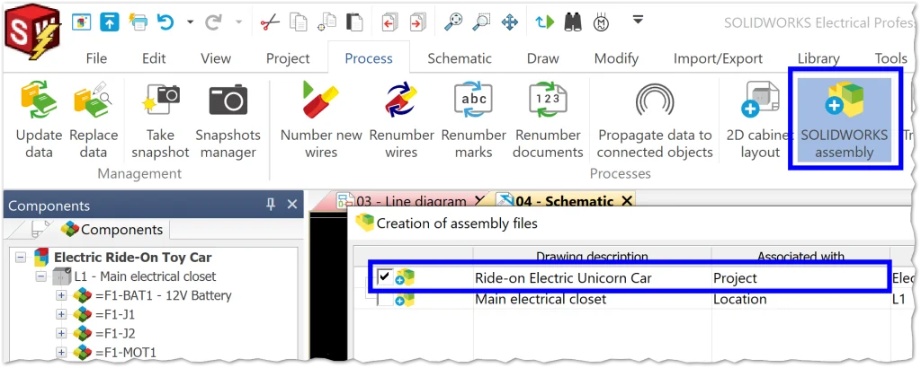 Let’s start by creating our assembly. From SOLIDWORKS Electrical 2D, we can quickly do this by going to Process > SOLIDWORKS assembly and selecting just our top Project-level assembly for creation. If this project were much bigger, I might consider splitting things up into subassemblies based on location, but this one is relatively simple, so we can do everything in one assembly without getting confused.