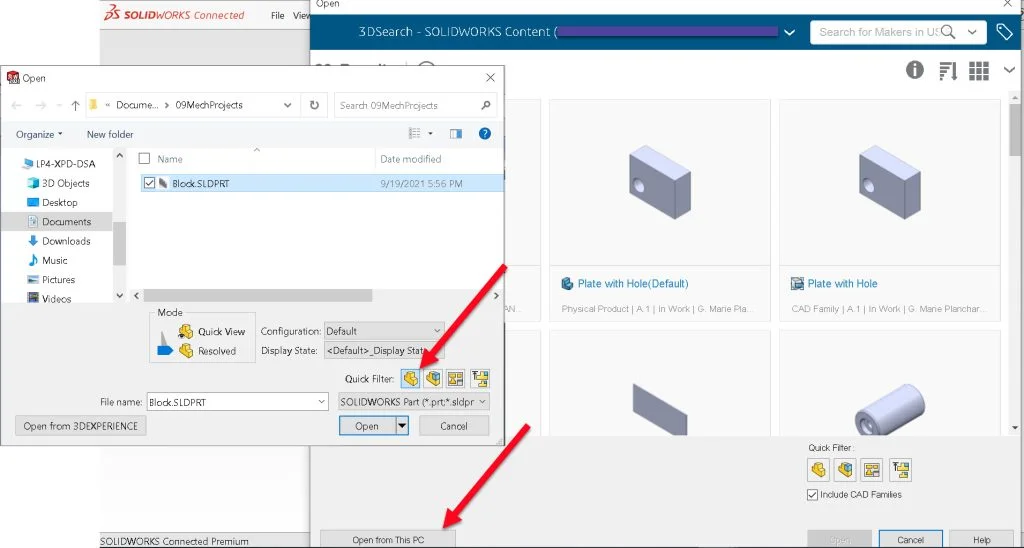 To open a SOLIDWORKS file saved to your Windows PC, select File>Open. From Windows, browse to select the part, assembly or drawing. From the 3DEXPERIENCE window, Select Open from This PC button on the lower left corner and browse to the correct folder.