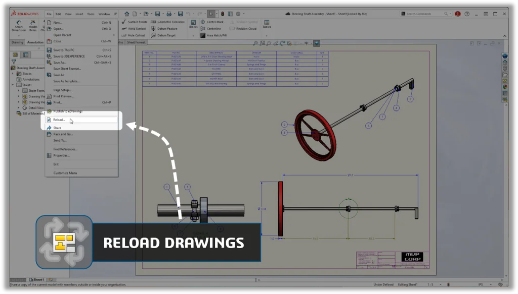 Part and assembly files have had the ability to reload a file from the file drop down menu. This is expected to now be supported for drawing files.