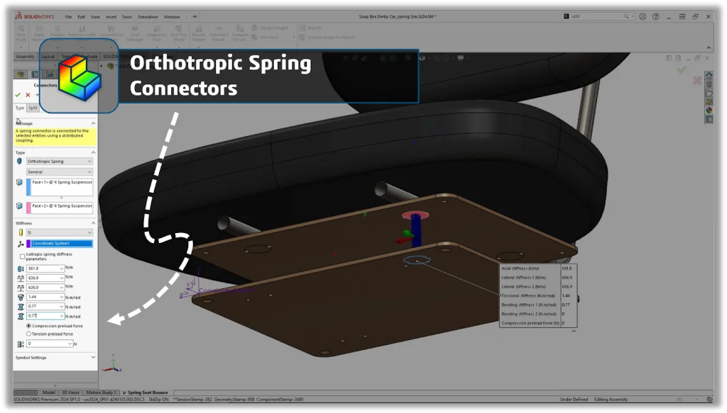 A new orthotropic spring connector allows for definition of a spring stiffness in axial, radial and torsional directions.