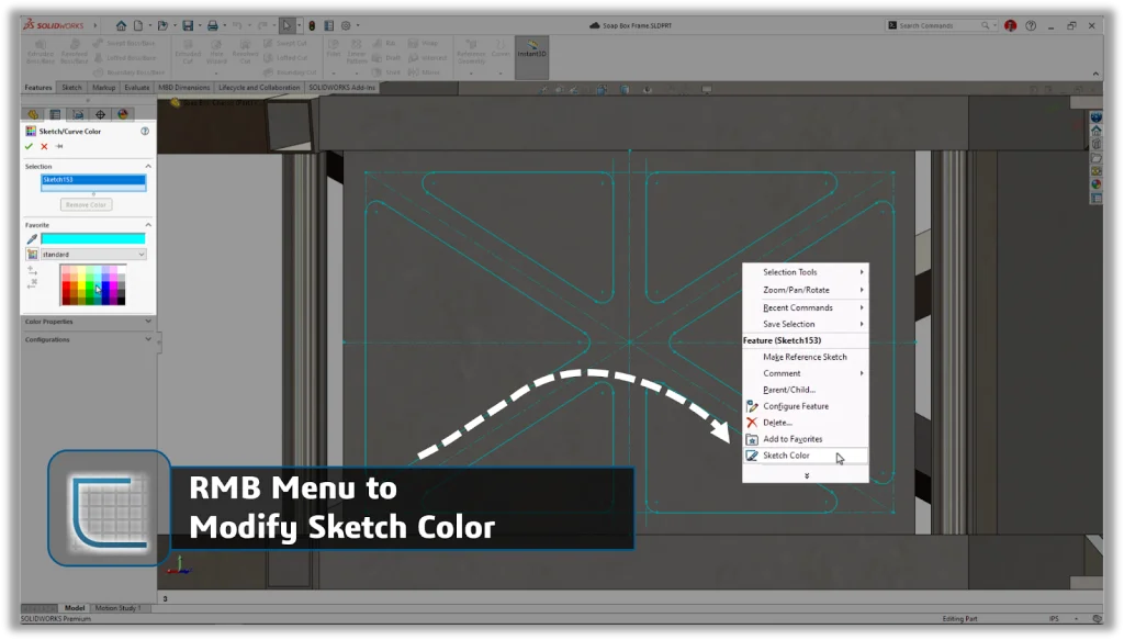 Available in SOLIDWORKS 2024 FD02/SP2, users can access the sketch color dialogue through the right mouse click button menu.