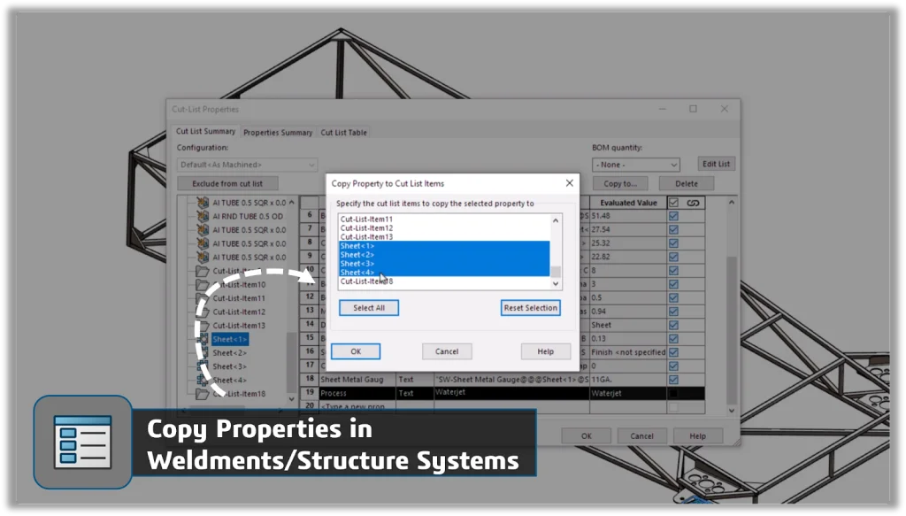 Custom properties can be easily applied to additional weldment cut list items with a simple copy and paste.