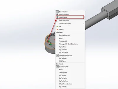 Selecting the bottom, inner face of this ratchet head without using the mouse or mouse gestures to rotate it has never been easier. All we’ll need to do is right-click on the face that is blocking the inner face (highlighted in orange), and click ‘Select Other’ from the toolbar that appears.