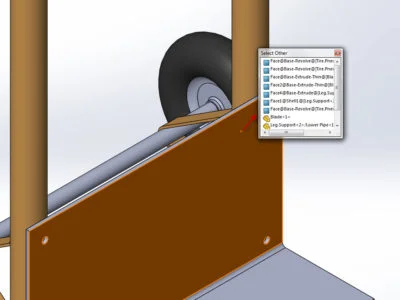 The same can be done for this hand truck assembly example. If we wanted to select the tire of the hand truck, just right-click on the entities blocking the tire and choose the ‘Select Other’ tool. The ‘Select Other’ tool window emerges and the entities that we’d like to choose from can be selected.