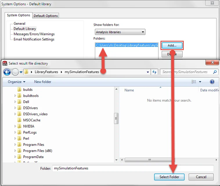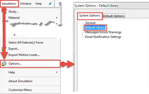 The first step is to ensure you dedicate a folder on your machine as the location where all your simulation library features would be saved. On the SOLIDWORKS menu, go to Simulation – Options – System Options – Default Library as shown below.