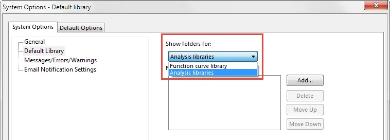 In the dialog box, click the drop down option under Show folders for: Select Analysis Libraries