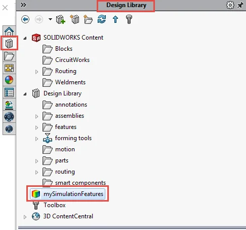 Below is a sample example of the simulation library that contains a lot of different types of simulation library features. Think about how the library feature folder itself can reside in a network location and is accessible to all designers and engineers across the company!