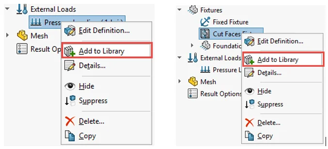 In the SOLIDWORKS Simulation feature tree, RMB on a load, fixture or a connector feature and select Add to Library as shown below.