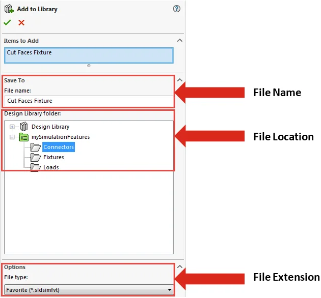 In the Add to Library dialog box, input a file name and location to store the library feature. Notice that the feature is saved as a file with extension *.fldsimfvt