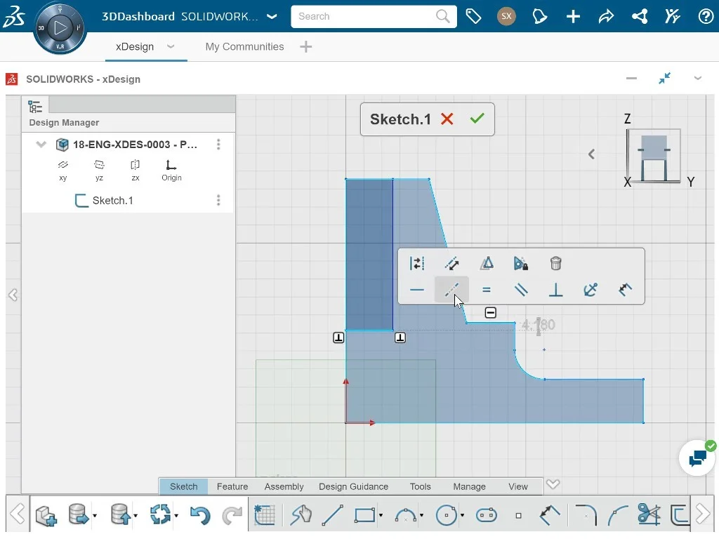 Let’s say that we want to add a construction line that shows that these two lines are in fact colinear. I can easily draw a line connecting them, and then switch it to construction geometry by selecting the “Construction Line” icon. This capability can be enabled for any segment in a sketch.