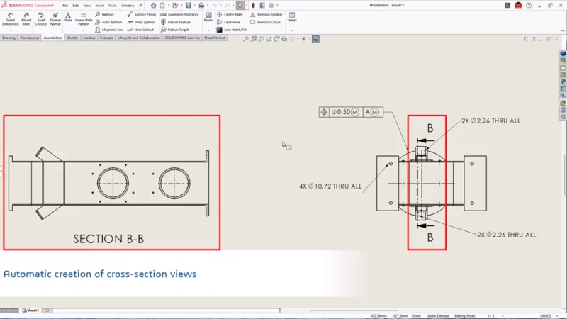 With the click of a button, you can generate your drawing sheet and move on to editing. If the design requires a cut, the system adds a section view automatically, and you can adjust or add another. Long parts remain legible because the system picks the best fit for a sheet size, ensuring views and annotations fit the sheet.