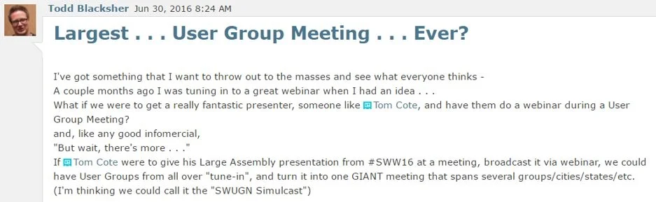 As a user group leader, Todd is more than aware of the difficulty of securing dynamic speakers and engaging presentations on a consistent basis for quarterly or monthly user group meetings. Just the travel costs and logistics alone can be daunting to bring in a noted speaker to his area, if not outright prohibitive. But this doesn’t deter Todd. Instead, he comes up with a plan.