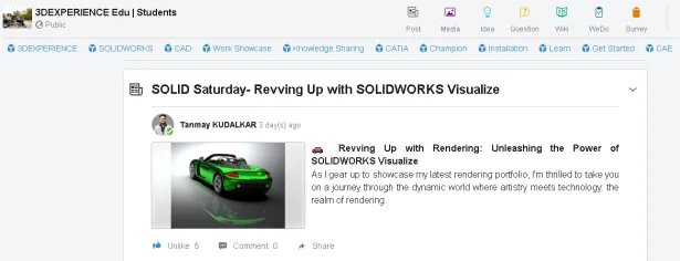 As part of DASSAULT SYSTEMES, we have free user communities for people with common interests in design, life sciences, manufacturing, mining, simulation, and visual artists. There are also specific group communities for students, educators and makers. In these communities, you search for information, ask questions, upload an image, or share tips with others.