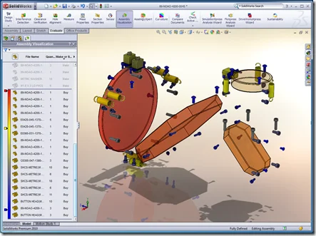 Image (B) Assembly tree is sorted by Mass and colour coded to help understand the impact of mass in the design.