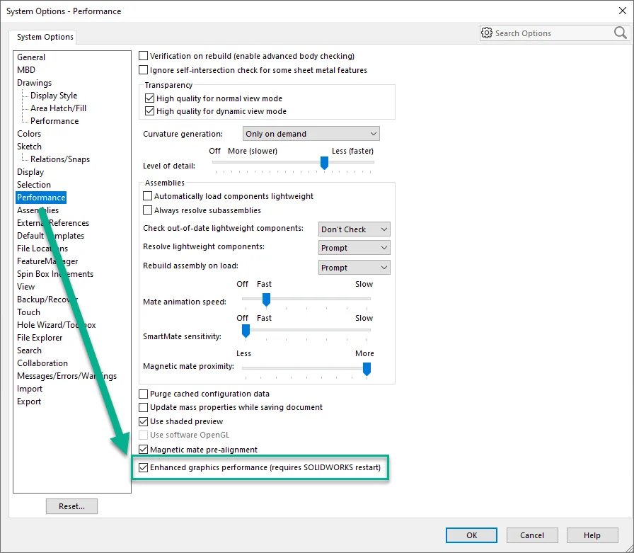 Model Display: SOLIDWORKS 2021 improves performance for GPU-based occlusion culling, GPU-based silhouette edges, zooming and panning within parts, assemblies and drawings, and switching configurations in large assemblies. This means that your graphics card will help offload rendering resources from your CPU, making your general experience faster and smoother. This enhancement was initially released in 2019, and it is on by default in 2021. If this option is grayed out for you, please update your graphics driver. If it is still grayed out, please ask your reseller for help.