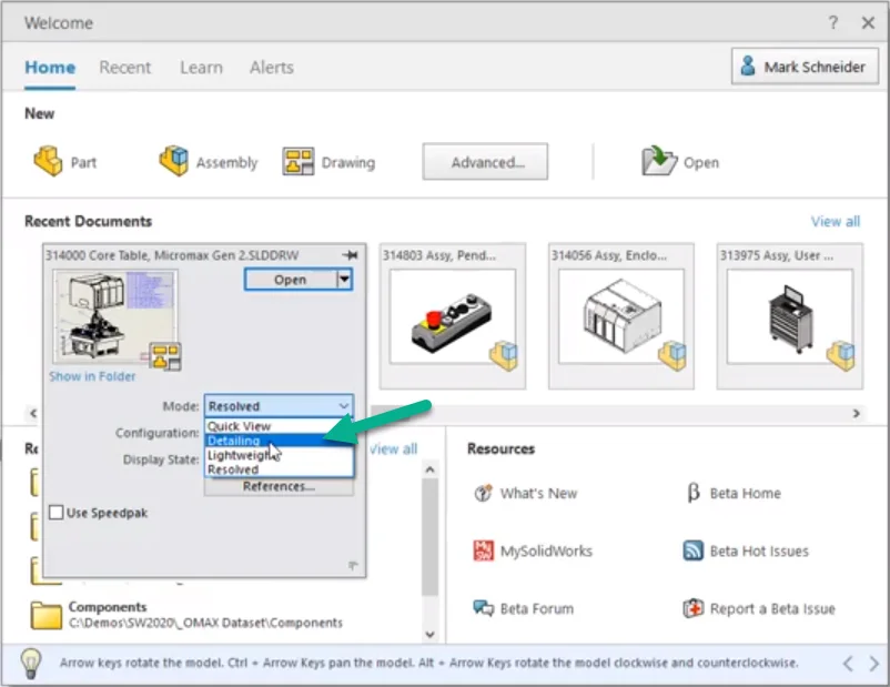 Assemblies: This performance boost means you can open large assemblies with thousands of components in seconds using Lightweight mode. Lightweight components are now automatically loaded into memory when expanded in the feature manager. Opening assemblies with parts that have many configurations is also much faster. It takes less time to update assemblies that have many mates – although it is always a best practice to define mates between components in sub-assemblies, rather than all in one main assembly. Closing assemblies without saving is also much faster in 2021.