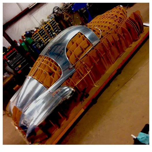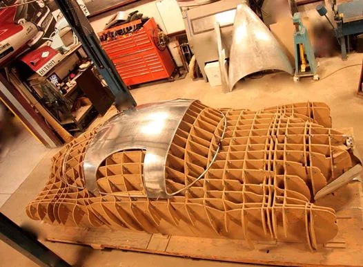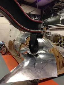 The buck represents the overall shape of the body. Each piece is formed on the wheel then laid on the buck. This process is repeated many, many times in order to know if the piece has been formed correctly. It may take several days to form a single panel correctly. To complete this part of the body correctly you have to have patience. Rushing the process will cause a misshapen part and if that happens, you start over again.