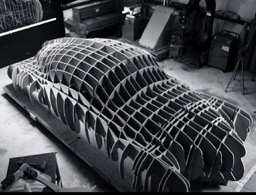 Now in order to know if the metal has been shaped correctly the piece is laid on a wooded “buck”. The buck, as shown below, is really the first step in creating a car body. It was created from the scanned data from the plaster model as shown in this image:
