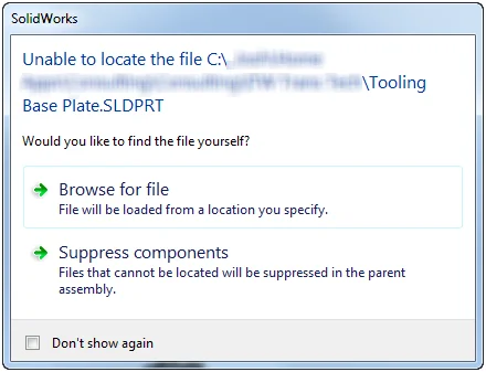 It is important to know what the messages mean and what the consequence is when we check the box for Don’t show again. For example warning below come up when we open an assembly and SolidWorks cannot find a part or assembly file in the location it was once in or if the name changed. If we choose the option of Suppress and Don’t show again then for all other files we open that cannot find a referenced file then they will automatically be suppressed.