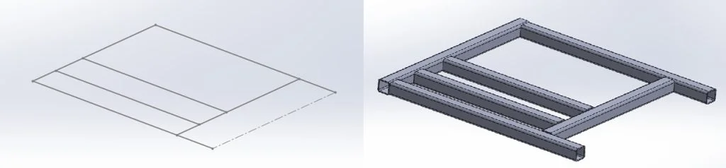 I started this portion of the build by creating a simple sketch with the 4 mounting hole positions for the rear axle, this gave me some strict geometry I needed to support with metalwork. From here I headed to my toolbar to load up weldments. Now I’m very open and say I don’t use weldments anywhere near as much as I should, some of this comes down to the majority of my day job not focusing on sheet metal or metal framework but some of it also comes down to laziness. However, I figured as I was writing a blog I’d show off how easy it can be to pull together framework models using weldments and some of the simple tools within it.