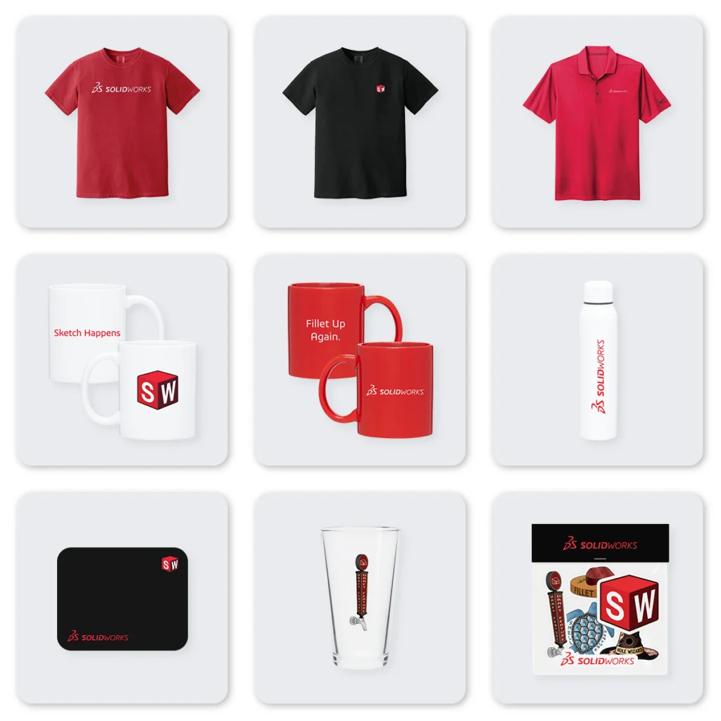 - Apparel – T-shirts featuring SOLIDWORKS designs (**hoodies and hats coming soon!**)