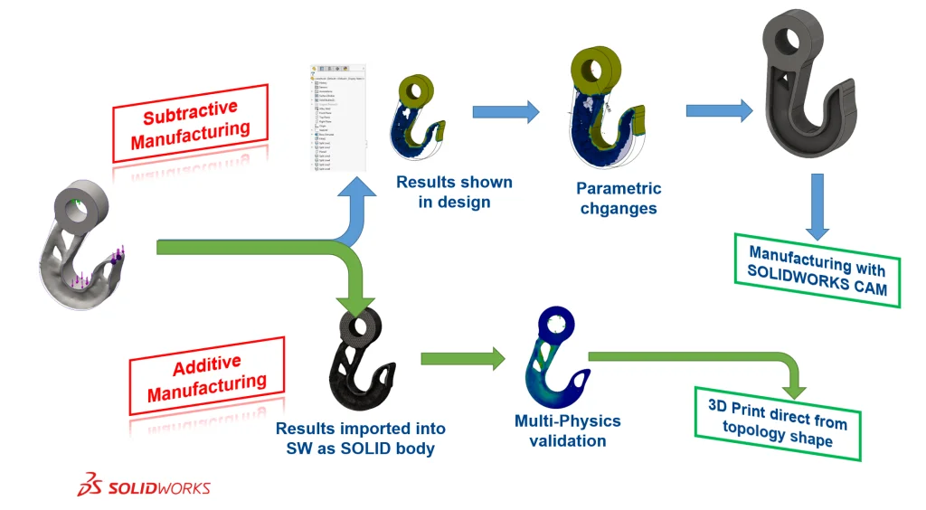 But once you have this shape what do you do with it? This shape doesn’t just live in the simulation tool. It can be saved as a body (smoothed mesh) into your SOLIDWORKS part file. Once it’s in your design tool it is a full citizen of the design process, it can be managed in PDM, be the basis of further design changes with new versioning and be used in further simulation calculations. Additive manufacturing tools can be used to directly print components, incorporating a topology smoothed mesh body.