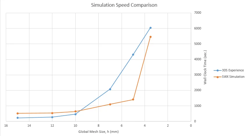 “We should also note that the results from this analysis show that the materials peak stress is below the material yield point, and the deflections are small. This analysis is linear in nature, i.e. the loads and deflections are proportional. This is important when we compare the solution time, in the graph below, using the same machine and mesh density we can see that SOLIDWORKS Simulation globally solved faster than Structural Professional Engineer” added James Cardillo.