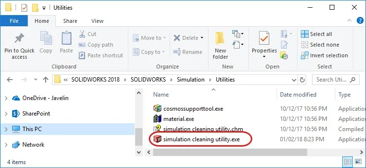 Browse to the default location of the tool which is “C:Program FilesSOLIDWORKS CorpSOLIDWORKSSimulationUtilities” and double click on the Simulation Cleaning Utility executable as shown in the figure below.