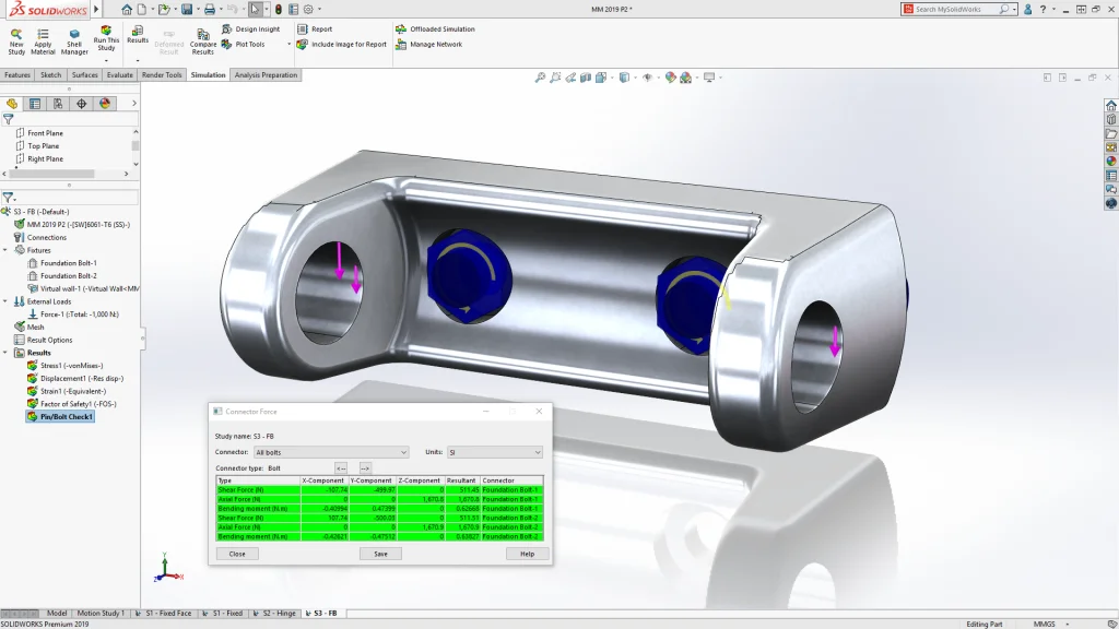 An additional bonus to this setup, SOLIDWORKS Simulation provides BOLT CHECK results. A quick check shows whether each bolt will support the load or fail and complete details of shear, axial, and bending stress are also delivered. This is valuable information and helps users make decisions early in the design process.