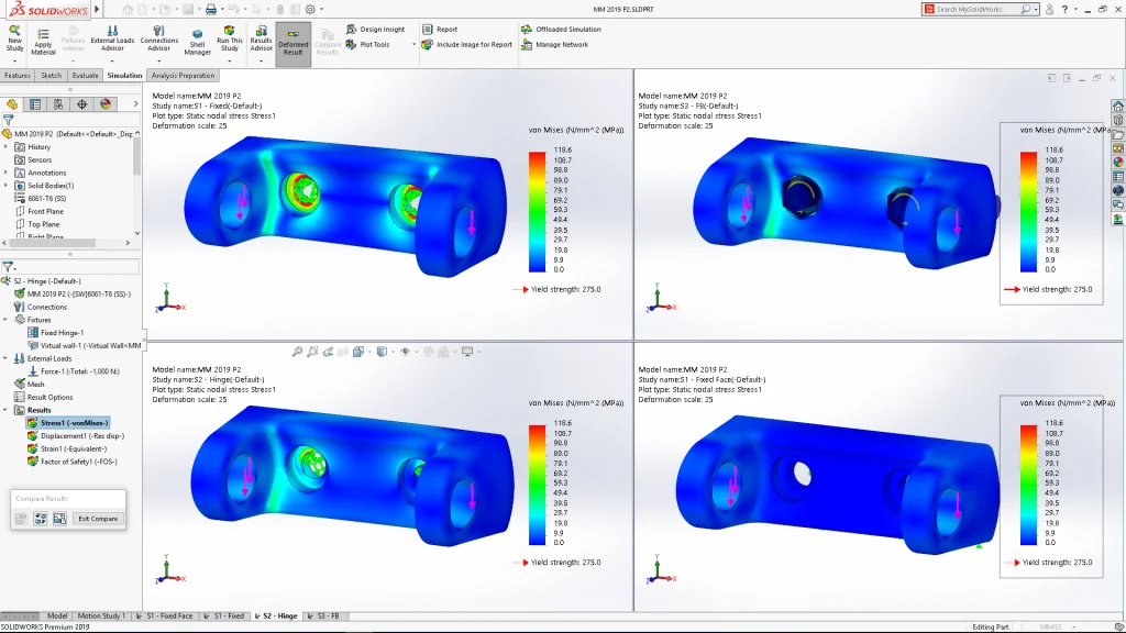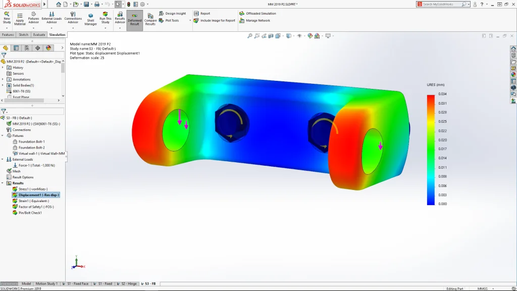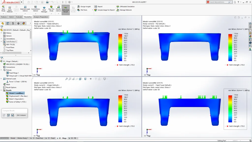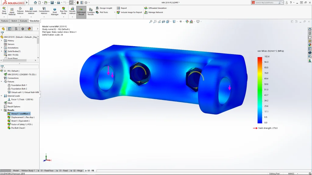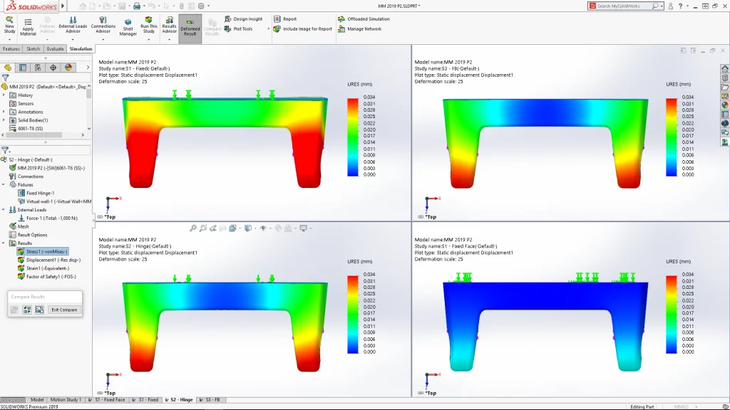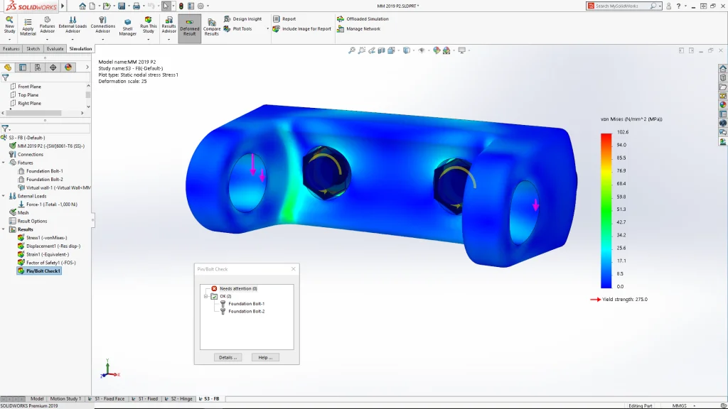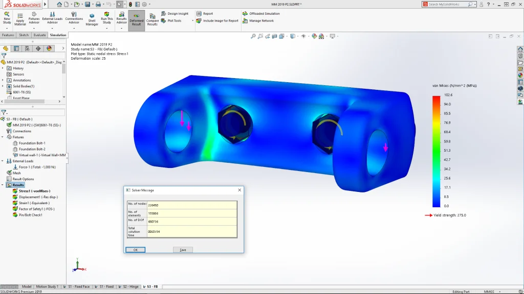 Comparing the four scenario’s is a great example. The first setup is simply not realistic. No work was lost using COPY STUDY and selecting new fixed faces for the second attempt and most importantly, all of this was done in minutes if not seconds! While not perfect, these results are more than adequate for early design validation as we did for Model Mania 2019. The final step is what really shows the power of SOLIDWORKS Simulation as a tool for ALL. Leveraging the initial “Design Validation” study and making simple changes to the setup delivered high fidelity results on the design model plus bonus results on the bolt connectors, all in just a few minutes.