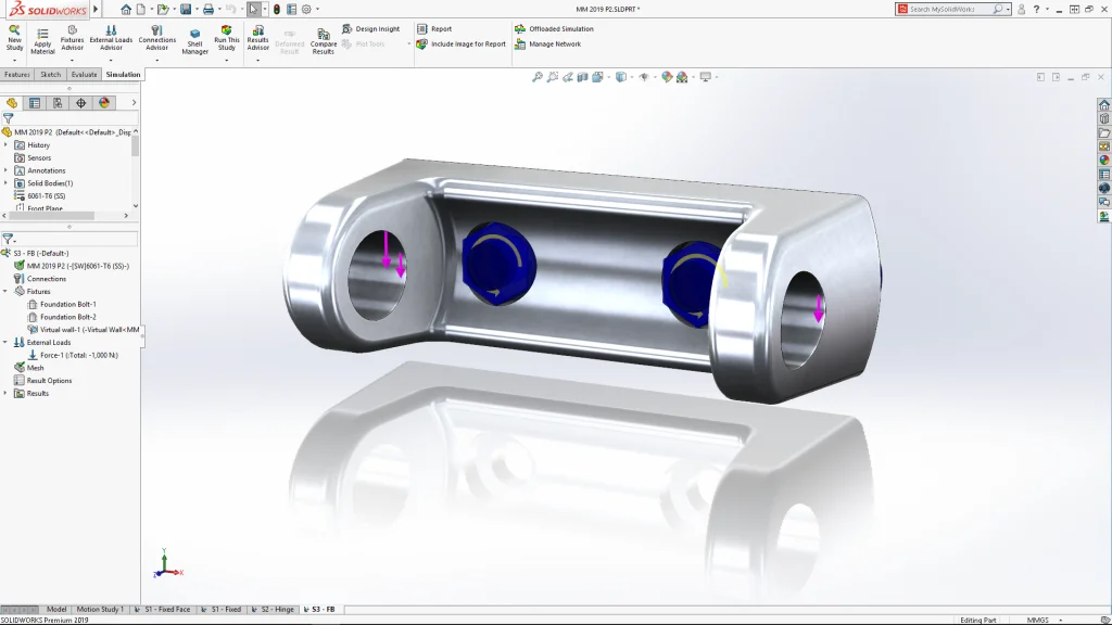 Having gone this far, we all face the “GOOD ENOUGH” versus “PERFECTION” scenario. Since SOLIDWORKS Simulation makes it so easy to try one more setup, it was time try the most realistic setup possible. This required removing the FIXED-HINGED restraint and adding FOUNDATION BOLTS to the mounting holes. FOUNDATION BOLTS use the VIRTUAL WALL from the previous setup and allow for material selection, fastener strength data, and even a pre-load.