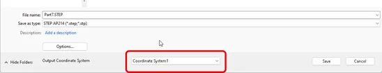 - While saving the part, select the new Coordinate System from the Output Coordinate System dropdown.The new file will now have a correct view orientation when opened.