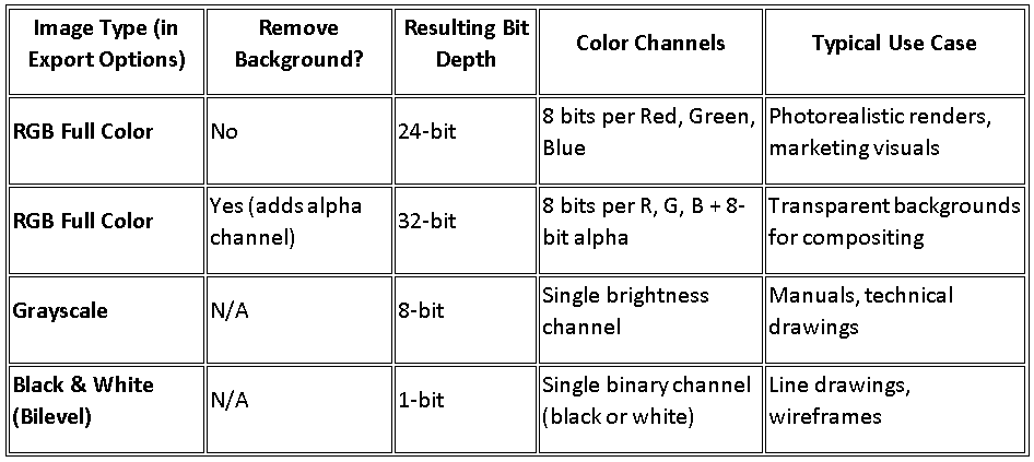 Each Image Type in SOLIDWORKS defines how colors and transparency are handled during export. Let’s look into each type to understand how bit depth affects image quality and file output.