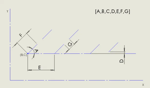 There are certain rules to be followed while creating or customizing the hatch patterns. These rules are mentioned in detail inside the “Sldwks.ptn” file itself.The “Sldwks.ptn” file consists of set of values [A, B, C, D, E, F, G]. Changing these values, affects the hatch pattern style. These values indicate and affect different parameters which can be visualized with the help of image below: