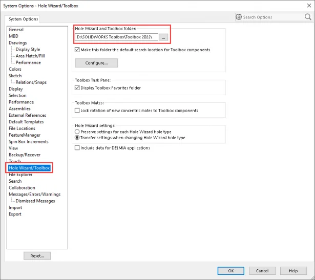 The path of Toolbox folder can be found by opening the version of SOLIDWORKS® we are attempting to Install/Upgrade > Tools > Options > System Options > Hole Wizard/Toolbox.