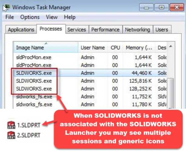 Bonus SOLIDWORKS® specific issue that is seen quite often. Generic SOLIDWORKS® icons and opening multiple SOLIDWORKS sessions: