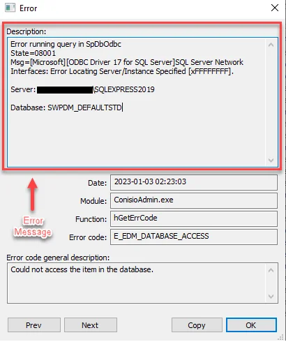 - Whenever you see the message ‘Could not access the database’ when login into the vault, it is important to go through the details of the error in the SOLIDWORKS® PDM Client log (Open Administration Tool, and Double Click on ‘Log File’ found under Local Settings). The next thing to check is the SQL Server details, as the instance/database name may be incorrectly defined. We have seen some cases where during a server upgrade or Move/Restore scenario, the SQL Server is pointing toward the old machine details, and just checking the error thoroughly can save a lot of time and this issue can be rectified immediately (Refer Fig 1.3.1 & 1.3.2).
