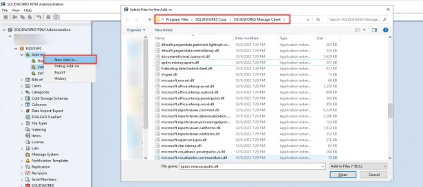 - Expand the ‘Add-ins’ node > right-click on the Manage add-in ‘swm.swpdm’ file> click ‘Open’.