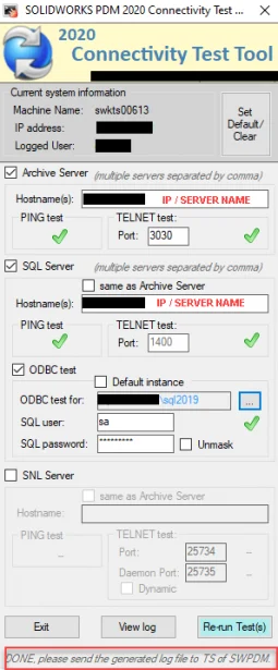 - The next thing to check is whether the client can communicate with the server. You can either ping/telnet Server machine or use the Connectivity Test Tool (Refer QA00000119794 in Knowledge Base) from the client machine (Refer Fig 1.4). If the PDM client machine is not able to communicate with the SQL Server, it is recommended to involve the IT team to look as if the necessary ports are open, and not blocked by any firewall.