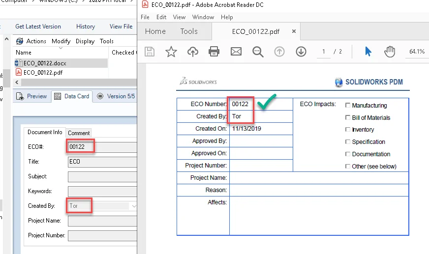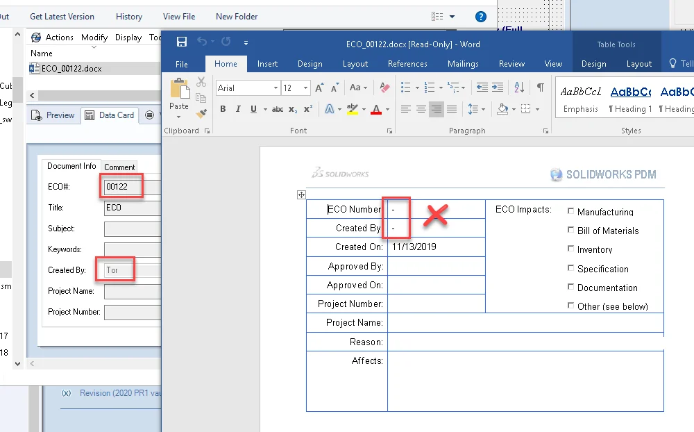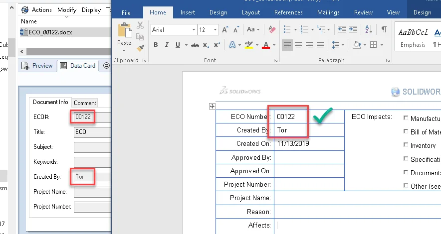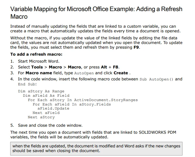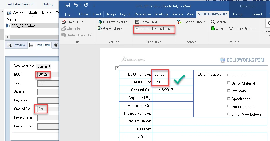 Alternatively, you could enable the “Update Linked Fields” option in the SOLIDWORKS PDM Office add-in to automatically refresh the fields when the document is opened.
