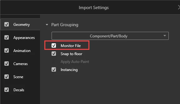 - When you import a CAD model from local drive, you can select the Monitor File option in the Import Settings dialog as shown below
