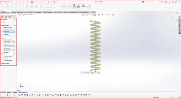 - Define the path for the sweep, typically aligned with the spring’s free length.