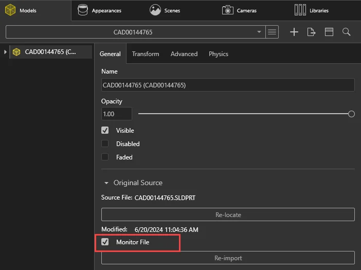 Visualize has a useful setting Monitor File that allows a Visualize project to update any changes made to the imported CAD model from SOLIDWORKS. There are two ways to activate it: