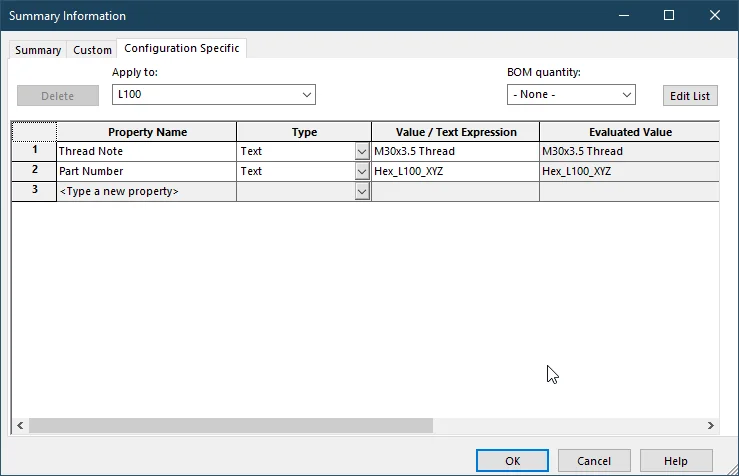You can also create custom properties that you want in BOM or in drawings. For example, here I have added the thread note and part number. You can add multiple different properties as per your need.