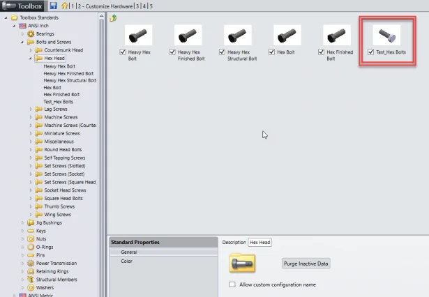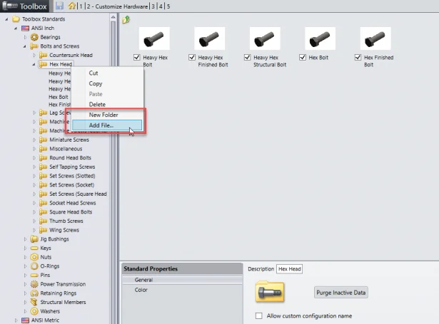 In the following image, ANSI Inch > Hex Head folder is selected and we will add a new hex bolt type.