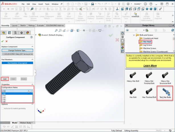 For example here, I have created this hex bolt in SOLIDWORKS and then added configurations for variations in the lengths of the bolt. More configurations could also be added clubbing variations in different parameters like Head Height, Shank Length, Thread length, Diameter etc. Use Design Table to optimize the configuration creation process.
